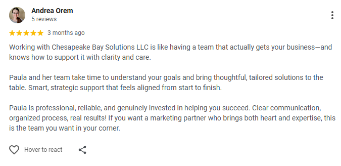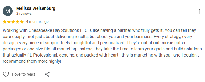 Every day without a tailored, Chesapeake Bay Solutions strategy is another day your business risks missing out on valuable local customers. Without a plan that connects with your community, the hard work you’re putting in may go unnoticed. Why let your competitors get the sales that could be yours?
